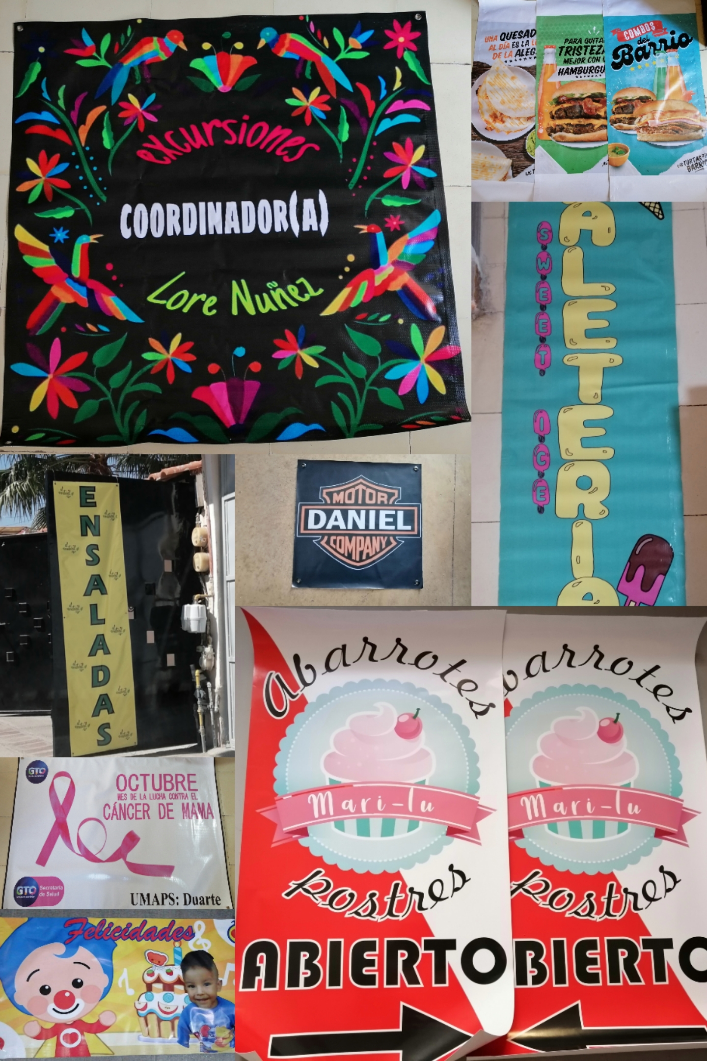 Realizamos articulos Promocionales (plumas, morrales, termos, loncheras, paraguas, gorras, mochilas, etc.), Impresión Digital (tarjetas de presentación, notas remisión, etiquetas impresas, etiquetas con corte a registro, boletos, talonarios, impresión tabloides, etc.) , Impresión de Lona y Vinil, Recortes de Vinil y más.