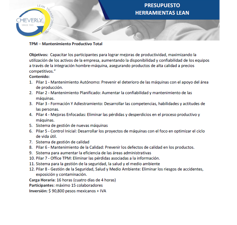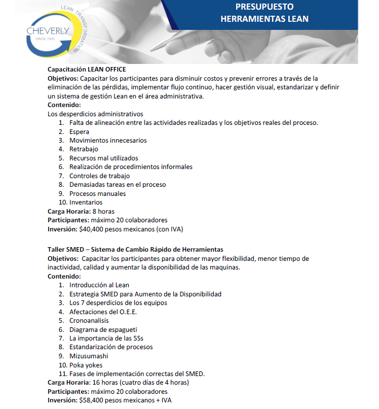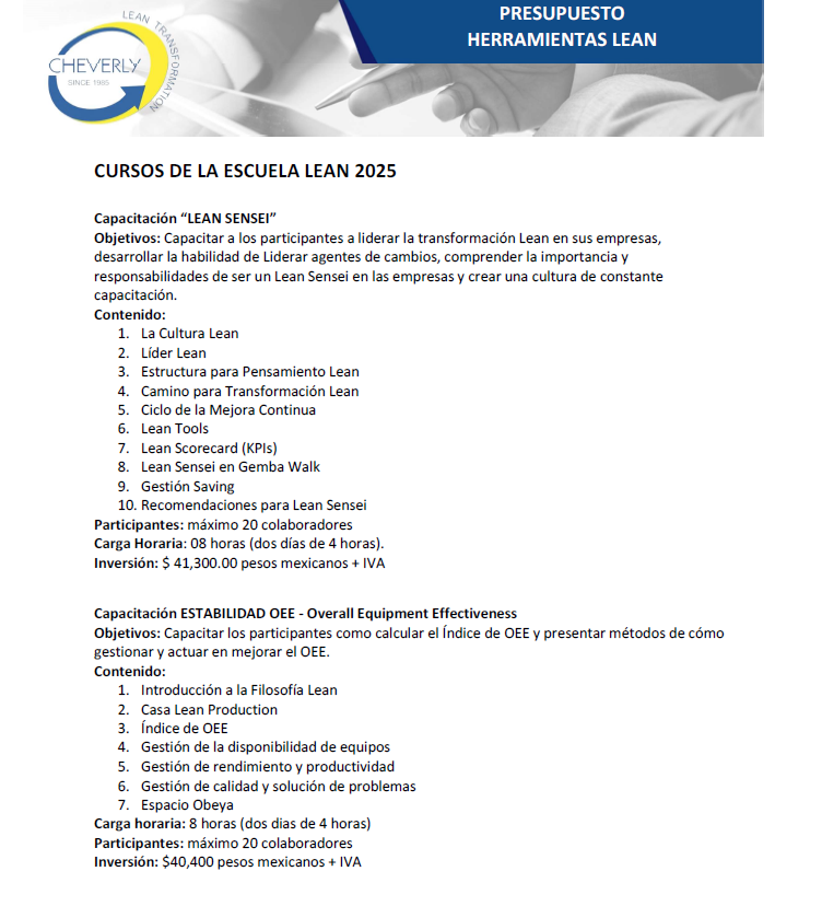 Filosofía Lean – Cheverly es una empresa de consultoría especializada en el desarrollo, implementación y certificación de la Filosofía Lean, orientada a ayudar a las organizaciones a alcanzar resultados de clase mundial. Fundada en 2016 en León, Guanajuato, como subsidiaria de la empresa brasileña Cheverly (establecida en 1985), la firma trabaja con empresas industriales y administrativas para identificar y eliminar desperdicios, mejorar la productividad, elevar la calidad y fortalecer la competitividad mediante una cultura de mejora continua.