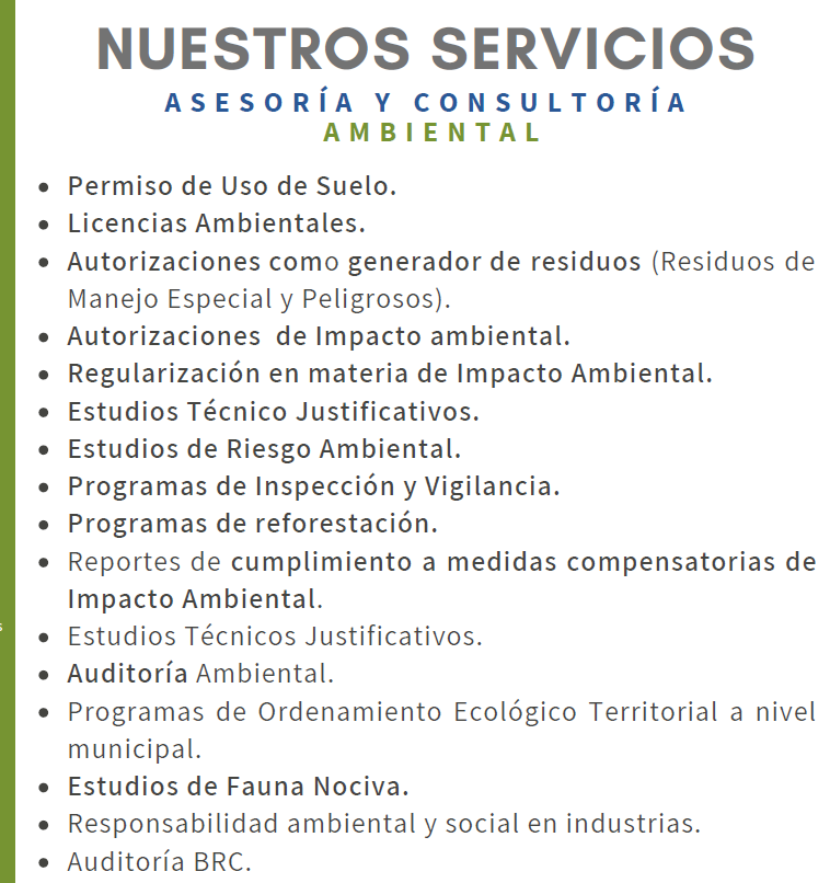 Estudios Especializados: Auditoría Ambiental, Estudios Técnico Justificativos, estudios de fauna nociva y programas de Ordenamiento Ecológico Territorial a nivel municipal.